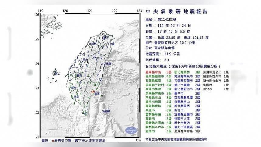 台東縣卑南鄉於24日17時47分發生芮氏規模6.1地震,最大震度達5弱,全台共有19個縣市出現明顯搖晃。前中央氣象局地震測報中心主任郭鎧紋指出,這起規模6.1地震所釋放的能量,約相當於0.7顆原子彈,也使得原先評估明年春節前後可能出現規模6以上地震的壓力,暫時獲得緩解。不過郭鎧紋也表示,雖然已多次釋放規模6以上地震能量,但整體能量是否完全消化,仍有不確定性。