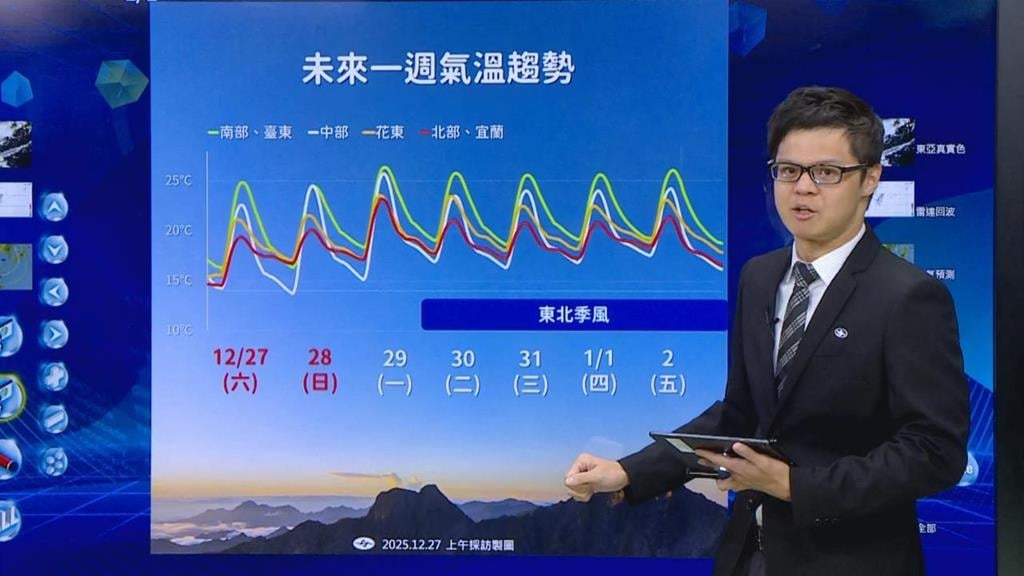 中央氣象署預報員曾昭誠今(27)日上午說明,由於大陸冷氣團會逐漸減弱,各地今天溫度回逐漸回升,預計到跨年前30日會有另一波東北季風南下,屆時北台灣、東半部等迎風面降雨機率則會增多,而下週一(29日)是未來一週平均最溫暖的一天,白天各地可達22、23度,甚至中南部會有25度以上的氣溫。