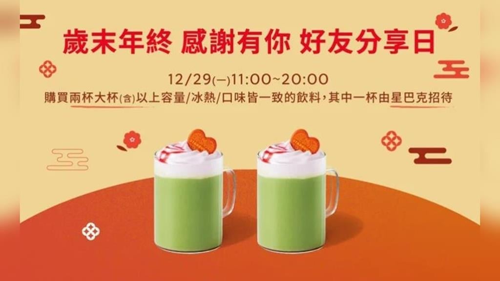 台灣星巴克推出「歲末年終 感謝有你 好友分享日」活動,明(29)天單日限定「大杯以上飲料買一送一」!另外,維也納風抹茶那堤也要回歸!