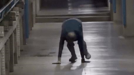 從原PO的影片中可以看到,空蕩蕩且燈光微弱的長廊盡頭,一名穿著深色衣物的阿北並非直立行走,而是全身伏地、四肢著地,像極了恐怖電影中的動作。隨著距離拉近,仔細一看才發現,阿北左手上疑似戴著厚實的防護手套,正有節奏、律動的進行「爬行」。該畫面讓原PO嚇到直喊:「遇到這位真的有毛……」。