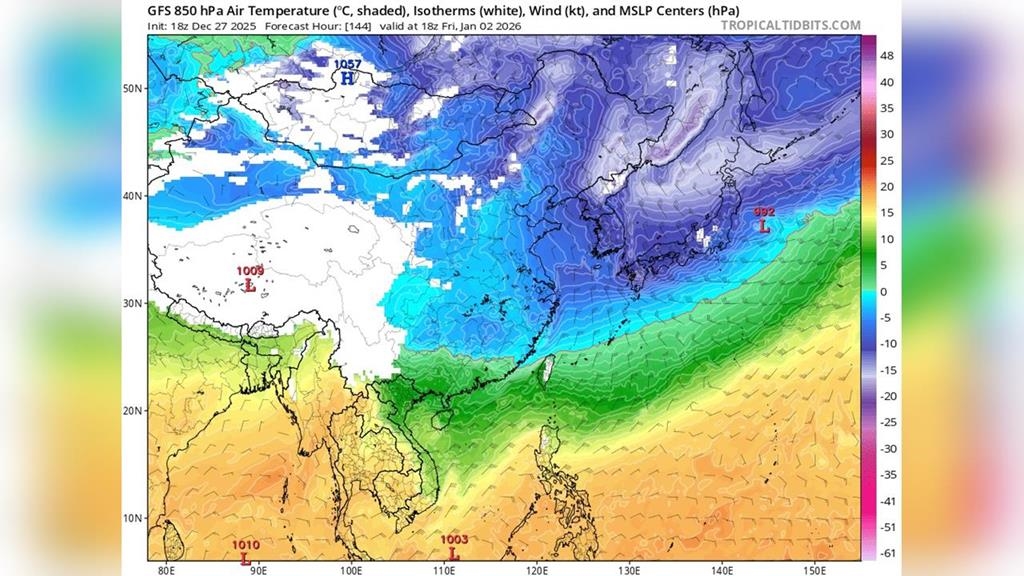 耶誕節後全台明顯降溫,明(29)日起稍微回暖,不過跨年、元旦又有一波冷空氣南下。對此,前中央氣象局長鄭明典今(28)日指出,「0度線」有機會接觸台灣,屆時溫度高機率降至10度以下,預估將達到「強烈大陸冷氣團」等級。