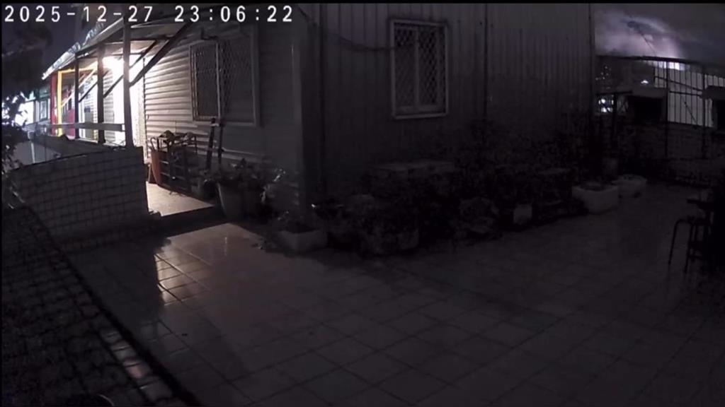 該網友分享家中監視器畫面,只見天空突然出現一道亮光,過沒多久監視器開始收錄到劇烈晃動的巨大聲響。該網友則心有餘悸表示:「打了個雷,馬上就大地震了。