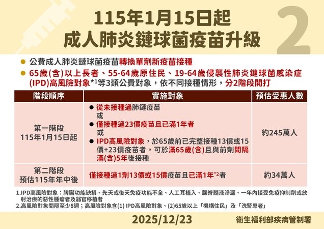 疾管署說明,新型肺鏈疫苗(包括20價或21價)已於英美加澳等多國使用;依臨床試驗結果及國際接種建議顯示,兩種新疫苗效果相當。衛生福利部傳染病防治諮詢會預防接種組(ACIP)今(114)年3月及9月會議決議,同意轉換單劑新疫苗(20價或21價)接種,取代原本2劑疫苗(13價及23價各1劑)。目前20價疫苗已取得國內藥品許可證,21價疫苗預計於明年4月取得國內藥證。因此,成人肺鏈疫苗升級接種作業規劃自明年1月15日開始實施,依肺鏈疫苗成人公費對象:65歲(含)以上長者、55-64歲原住民、19-64歲侵襲性肺炎鏈球菌感染症(IPD)高風險對象等3類之不同接種情形,分2階段開打,估計第一階段約有245萬人,第二階段約有34萬人符合資格。