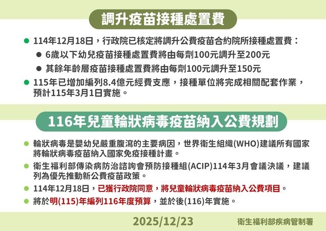 我國自107年起擴大全面提供預防接種合約院所公費疫苗每劑新臺幣(下同)100元接種處置費,惟已無法反映現今有形和無形成本的增加;另考量幼兒常規疫苗接種事前評估較耗費人力及內容複雜,經行政院今年12月18日核定,將調升接種處置費為6歲以下幼兒每劑200元、一般民眾每劑150元,並已增加編列8.4億元經費支應,接種單位將完成相關配套作業,預計明年3月1日實施,以鼓勵院所持續提供方便且優質的疫苗接種服務及照護幼兒健康。