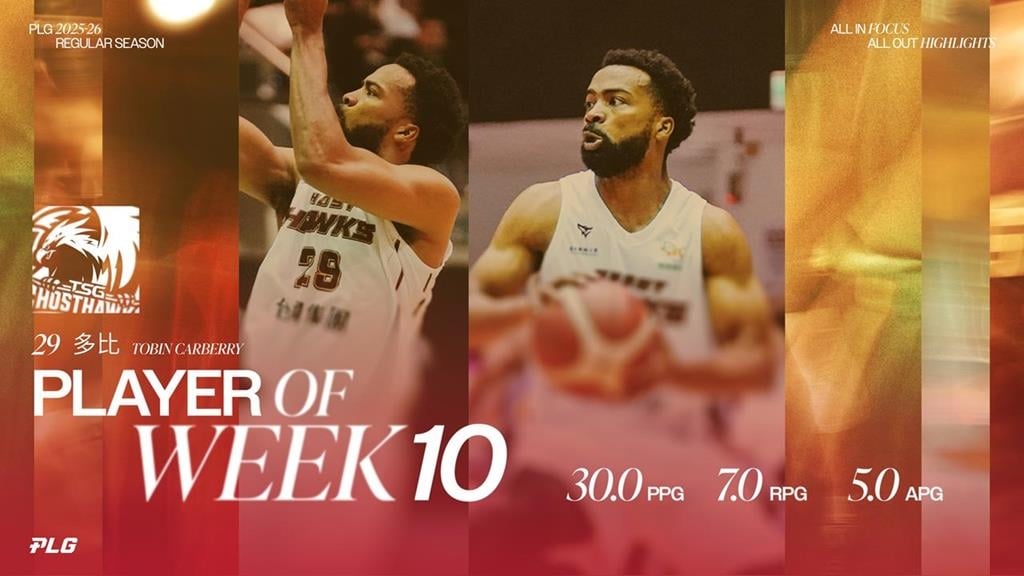 P. LEAGUE+ 2025-26 球季第 10 週單週最佳球員,由台鋼獵鷹的多比榮獲此殊榮。在上週(12月28日)對上洋基工程的賽事中,多比從替補出發繳出30分7籃板及5助攻的優異表現,除了帶領球隊順利收下勝利,也刷新了個人本季單場得分新高。多比高效率的進攻火力更幫助獵鷹轟下本季單場最高的114分,獲得單週聯盟單週最佳球員。