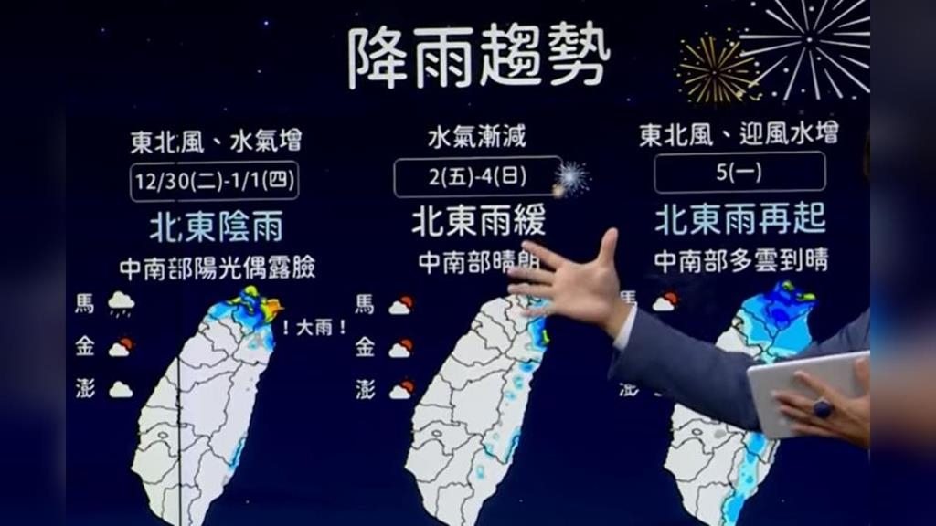 天空灰濛濛、偶而下起毛毛細雨,民眾雨衣不離身,還有人手上拿著厚重外套,受到東北風影響,北台灣恐怕得在濕冷天中,迎接2026!氣象署預報中心科長林伯東:「這幾天的水氣是比較多的,所以在基隆北海岸地區、宜蘭地區,甚至在桃園以北地區降雨都會稍微比較明顯,尤其是基隆北海岸以及宜蘭地區,甚至有可能會出現大雨的情形。」