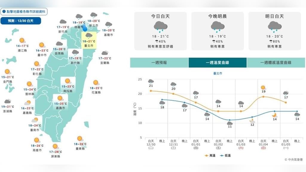 中央氣象署預報分析,週四起強烈大陸冷氣團南下,全台轉為寒冷型態,基隆北海岸及大台北地區降雨機率仍高。週五因水氣相對充沛,若氣溫與濕度配合條件足夠,北部及宜蘭1500至2000公尺高山,以及中部3000公尺以上高山,皆有機會迎來入冬初雪,計畫追雪的民眾可密切追蹤。