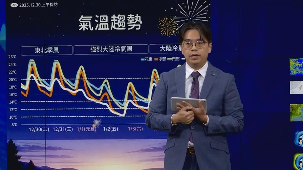 最後,林伯東也強調,跨年到元旦是降溫的過程,而北部到跨年這天基本上低溫會達14度,近山區會更低為12至14度;花東與南部則是溫度會再高一些。
