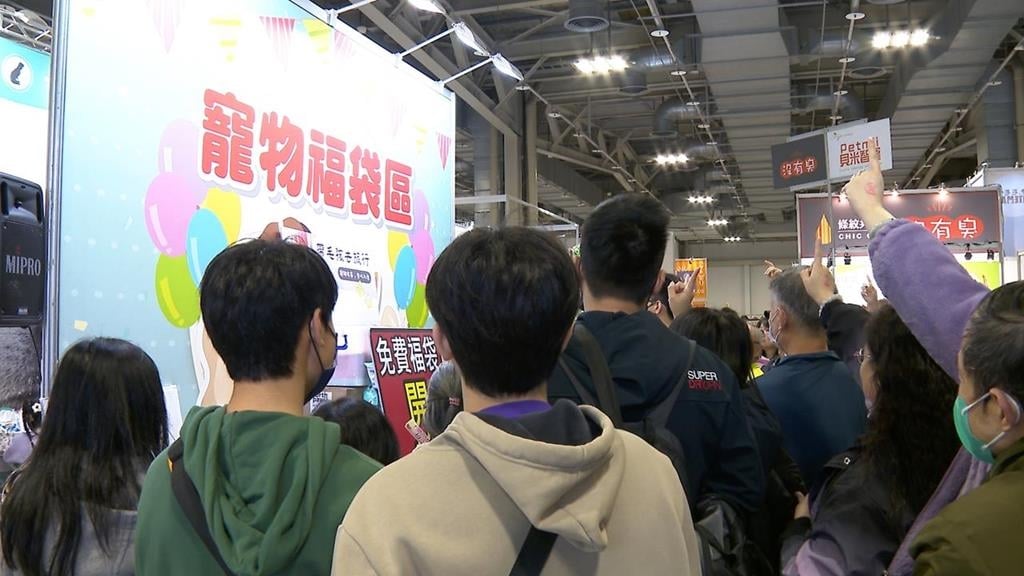 福袋、加碼好禮免費送,民眾高舉雙手,賣力搶答,拿好禮。元旦一早,寵物年貨街,飄出年味,湧進不少飼主,一早帶著毛孩來掃街。