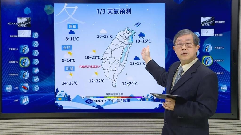 全台冷颼颼!中央氣象署上午表示,受到強烈大陸冷氣團影響,時間越晚氣溫恐怕會越低。氣象署預報員林定宜指出,今(2)日下半天時,基隆北海岸及大台北山區有些降雨,但從晚間到明(3)日,天氣將轉乾。氣溫方面,明日清晨中部以北、東北部會下滑到10度左右,南部12度,花東地區13、14度,中南部地區的日夜溫差大;另外,高雄以北、宜蘭、花蓮附近恐怕會出現黃燈以上的低溫燈號,民眾務必特別注意。