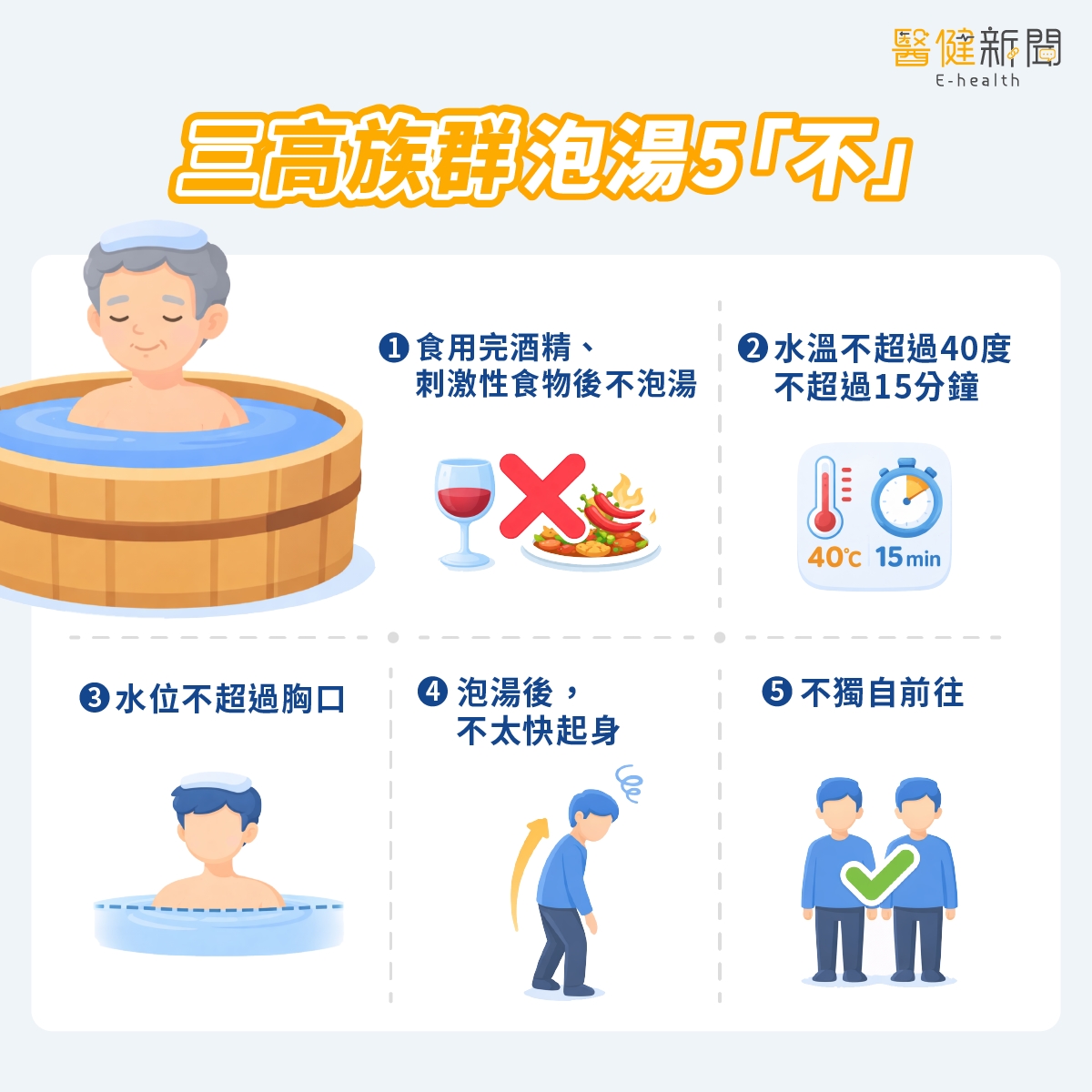 5. 不獨自前往:為了降低意外發生,建議可以揪親朋好友一起去,同時,應避免獨自在浴池中。