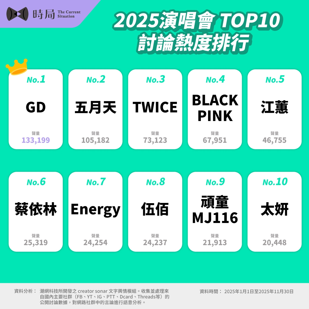 本次聲量統計由《時局 The Current Situation》平台提供,資料來源為潮網科技所開發之Creator sonar文字輿情模組。本次分析涵蓋的時間範圍為2025年1月1日至2025年11月30日。分析涵蓋國內主要社群(FB、YT、IG、PTT、Dcard、Threads),透過語意辨識與資料演算技術,整理特定期間內與關鍵詞相關之公開討論總量。