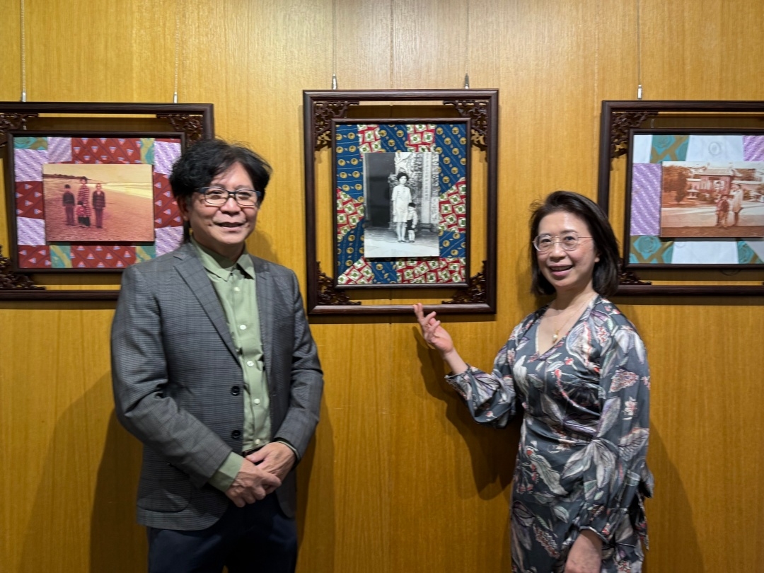 侯儀芬醫師(右)以先生蔡政峰醫師(左)舊領帶包覆家族老照片來探索家的意義。圖片來源/林秀美攝影