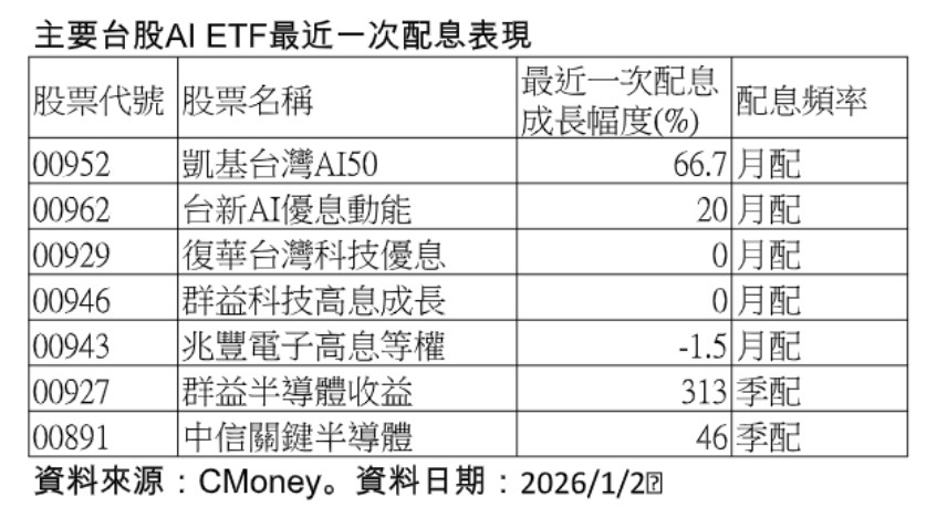 綜觀台股ETF當中,主要AI相關ETF,2025年不僅大多繳出雙位數報酬,連配息水準也頗有看頭。月配息ETF中,又以凱基台灣AI50(00952)霸氣配息,配息水準比前次成長66.7%,成為配息與股價同步成長的AI ETF指標之一。