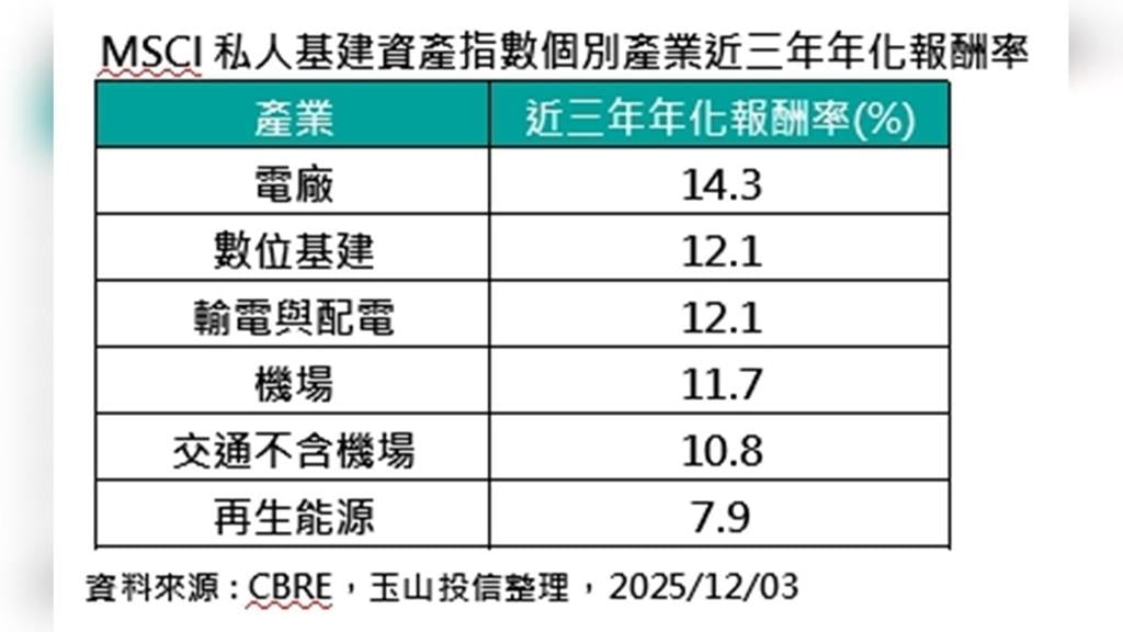 根據玉山投信的統計,在2025年第一季至第三季,基建產業私募金額首度突破1750億美元,預計資金挹注動能將持續到2025年底。龐大的資金不僅為產業注入活水,也反映出法人對基礎建設在推動AI與能源轉型中的關鍵角色的看好,成長潛力大幅提升。