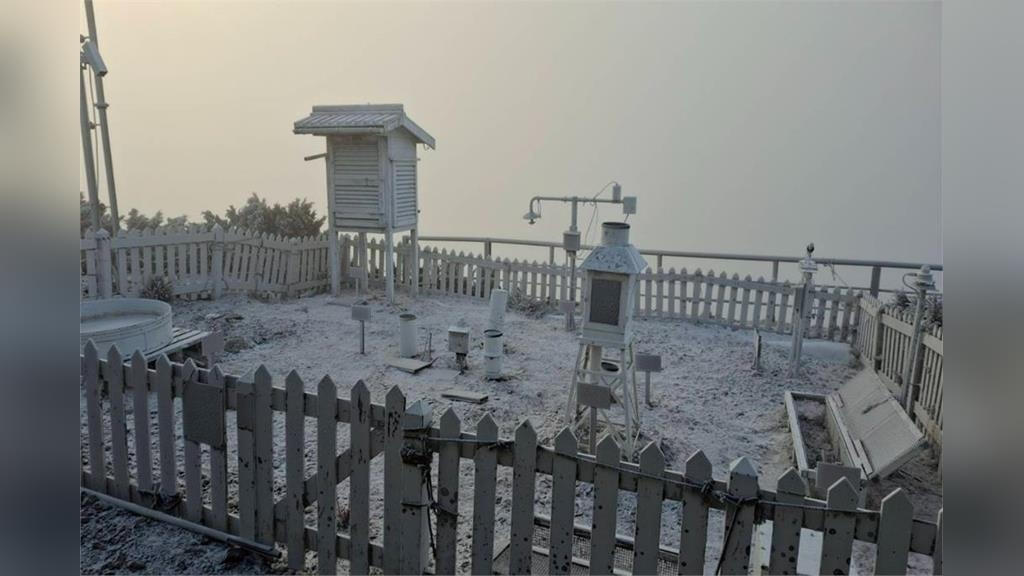 受到強烈大陸冷氣團影響,全台氣溫明顯下探,各地明顯轉冷,多處低溫跌破10度。嘉義阿里山今天(8日)上午短暫降雪,約持續20分鐘,山區瞬間披上一層白色雪衣。而位於海拔3858公尺的玉山氣象站,周邊植物也因霧淞附著而呈現一片銀白景象。