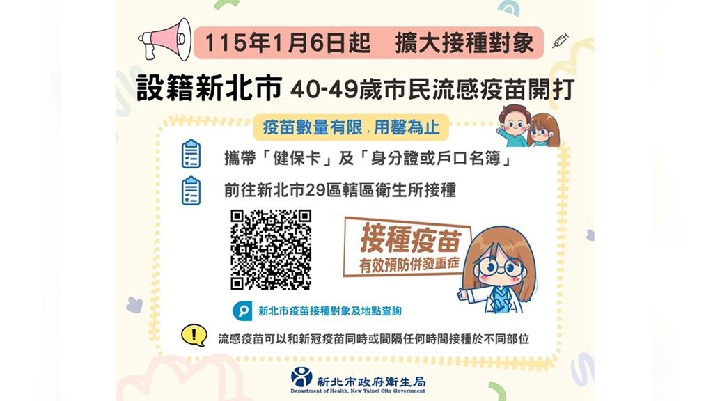 【原文出處】:流感疫苗接種再擴大 設籍新北市40至49歲市民開打