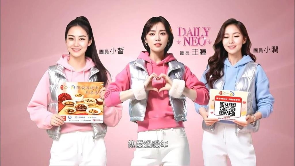 AI女團DailyNeo:「菜色有花生豬腳、香菇雞湯、素佛跳牆。」藝人王瞳和她的AI分身,所帶領的AI女團「DailyNeo」,合體為公益年菜募集行動宣傳,花生豬腳、麻油猴頭菇、梅干扣肉等,AI分身報起菜名,有模有樣。AI女團DailyNeo:「掃描QR code,就會進入娘家廚房公益首頁。」不只介紹,也手把手,教你怎麼訂!只要動動手指,再把商品加入購物車、按下結帳,6道年菜就會送到需要的長者手中!