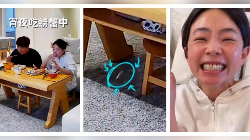 影片畫面顯示,夫妻倆當時坐在客廳吃宵夜,二伯手拿螃蟹大快朵頤,一邊看電視一邊啃殼,未料突然發出一聲清脆響聲,門牙貼片竟從口中彈出,飛落在地毯上,讓人措手不及。