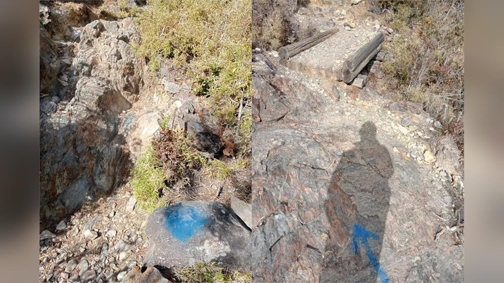玉管處表示,巡查人員近日在前峰登山口發現指標附近的山壁與步道遭噴上多處藍色圓點。園方初步以除漆溶劑清理成效不彰,隨後改以磨石方式刮除,才成功去除噴漆。由於步道沿線仍殘留多處藍色痕跡,後續將分批清除,儘速恢復原有景觀。