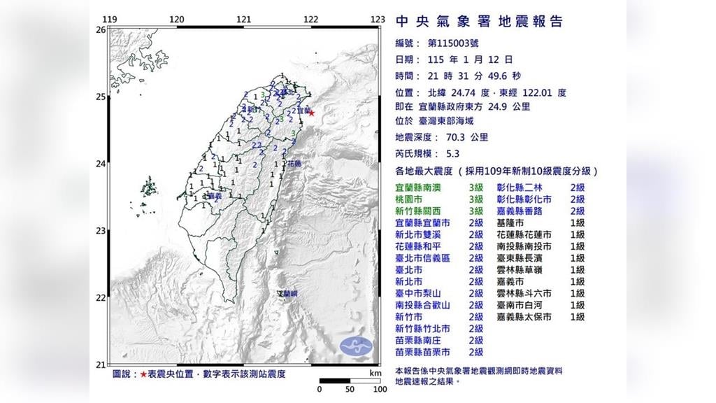 即時中心/徐子為報導今(12)晚間21時31分左右,宜蘭外海發生芮氏規模5.3有感地震,地震深度70.3公里,台灣本島震度3級地區包括宜蘭縣南澳、桃園市及新竹縣關西等地。