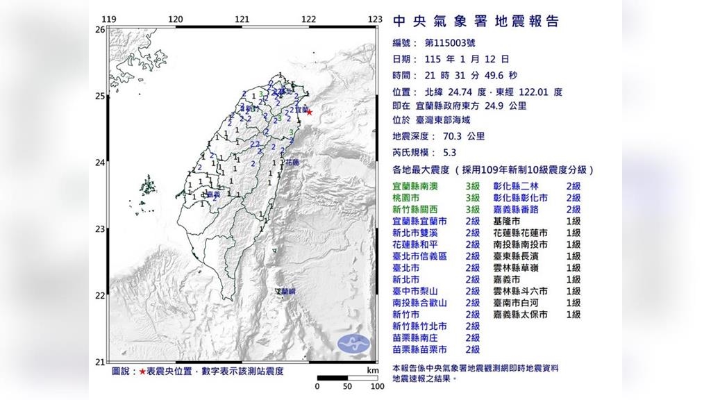 今(12)晚間21時31分左右,宜蘭外海發生芮氏規模5.3有感地震,地震深度70.3公里,台灣本島震度3級地區包括宜蘭縣南澳、桃園市及新竹縣關西等地。