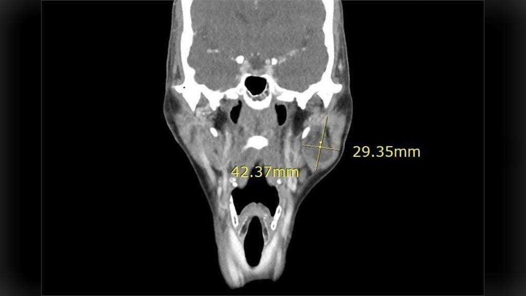 蔡祐任說,腮腺是位於雙側耳下方、主要負責分泌唾液的大型唾液腺,協助食物消化與維持口腔濕潤。當腮腺組織出現異常增生時,可能形成腮腺腫瘤。臨床上約8成的腮腺腫瘤屬於良性,但仍有約2成為惡性腫瘤,即腮腺癌,二者主要的症狀都是外觀的改變,並沒有痛感或明顯的功能異常,需要進一步檢查才能分辨。