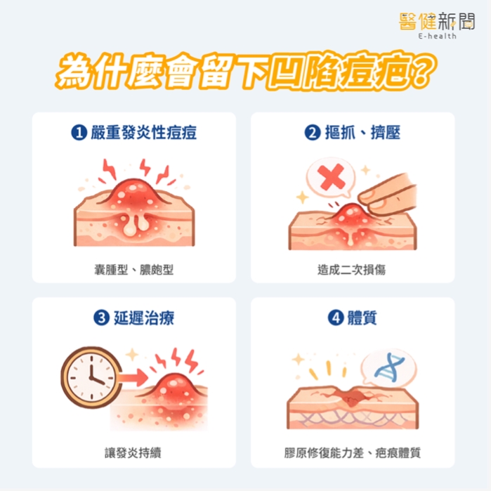 薛榮華醫師指出,痘痘發炎深入真皮層或皮下組織時,會破壞膠原蛋白架構。雖然皮膚會修復,但修復組織不如原本完整,表面失去支撐形成凹陷。