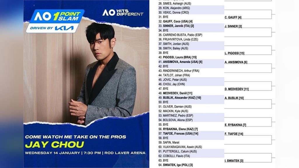 華語流行天王「周董」周杰倫登上網球年度四大滿貫之一的澳網,以「素人球員」身分參加創新賽制「一分大滿貫」,比賽將於台灣時間今(14日)下午4點半開打,由博斯運動、愛爾達體育台現場轉播,根據澳網官方公布最新籤表,周杰倫首輪抽中對上一名24歲澳洲陪練員約維奇(Petar Jovic),然而周杰倫括弧後面的國籍卻是代表中國的「CHN」,而非代表中華台北的「TPE」,引起網友熱議。