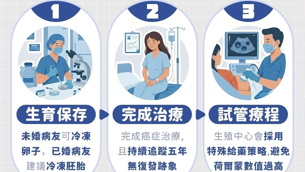「若已經完成癌症治療,且追蹤五年無復發,經評估許可後,目前的證據顯示是可以懷孕的,且懷孕並不會增加乳癌復發率!」至於治療後的試管療程,黃珽琦醫師說明,生殖中心會採用特殊的藥物策略,避免荷爾蒙數值衝得太高,兼顧療程效果與患者安全。因此,千萬不要因為過度恐懼,而錯失了生育保存或治療的黃金時間。