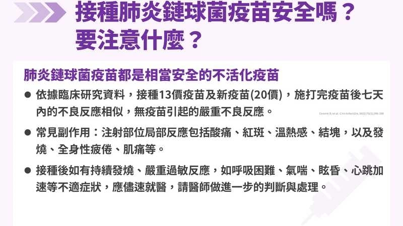然而,由於冬季為呼吸道感染高峰期,據國內外流行病學資料,肺炎長期位居國人十大死因前三名,肺炎鏈球菌在其中扮演關鍵角色,邱政洵副院長表示,13價結合型疫苗與新一代20價與21價疫苗皆有完整臨床經驗,其中接種20價或21價疫苗後,7天內出現的常見不良反應為注射部位痠痛、紅腫、溫熱感或短暫硬塊,少數出現輕微發燒或全身不適,且多為短暫反應,嚴重不良反應相當罕見,但若出現呼吸困難、全身性過敏反應或持續發燒,應立即就醫。