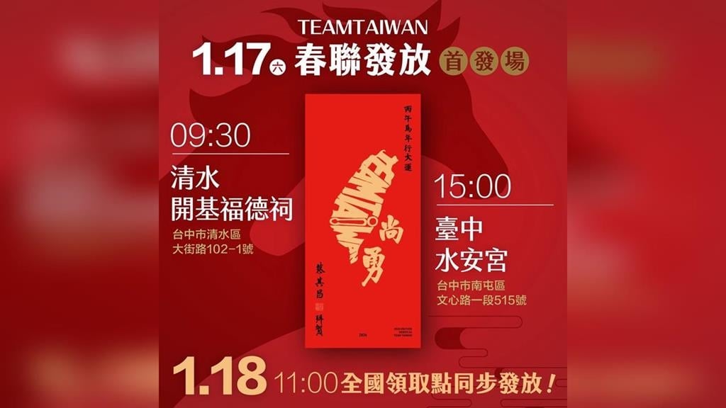 中職會長蔡其昌今天在臉書發文,今年「台灣尚勇」春聯的全國首發,週六將從他的家鄉台中開始。今年他首印30萬份「臺灣尚勇」春聯,18日上午11點在全台200多處據點同步發放。