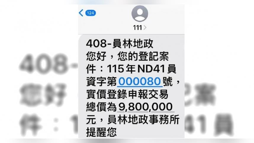 對此,員林地政事務所說明,地政所於115年1月16日下午15時32分所發送「115年ND41員資字第000080號實價登錄簡訊通知」,因系統異常誤發,導致民眾收到錯誤訊息,請民眾勿予理會。對於因此造成的困擾與不便,本所深表歉意,並已即刻進行系統檢測與修正,以避免類似情況再次發生。