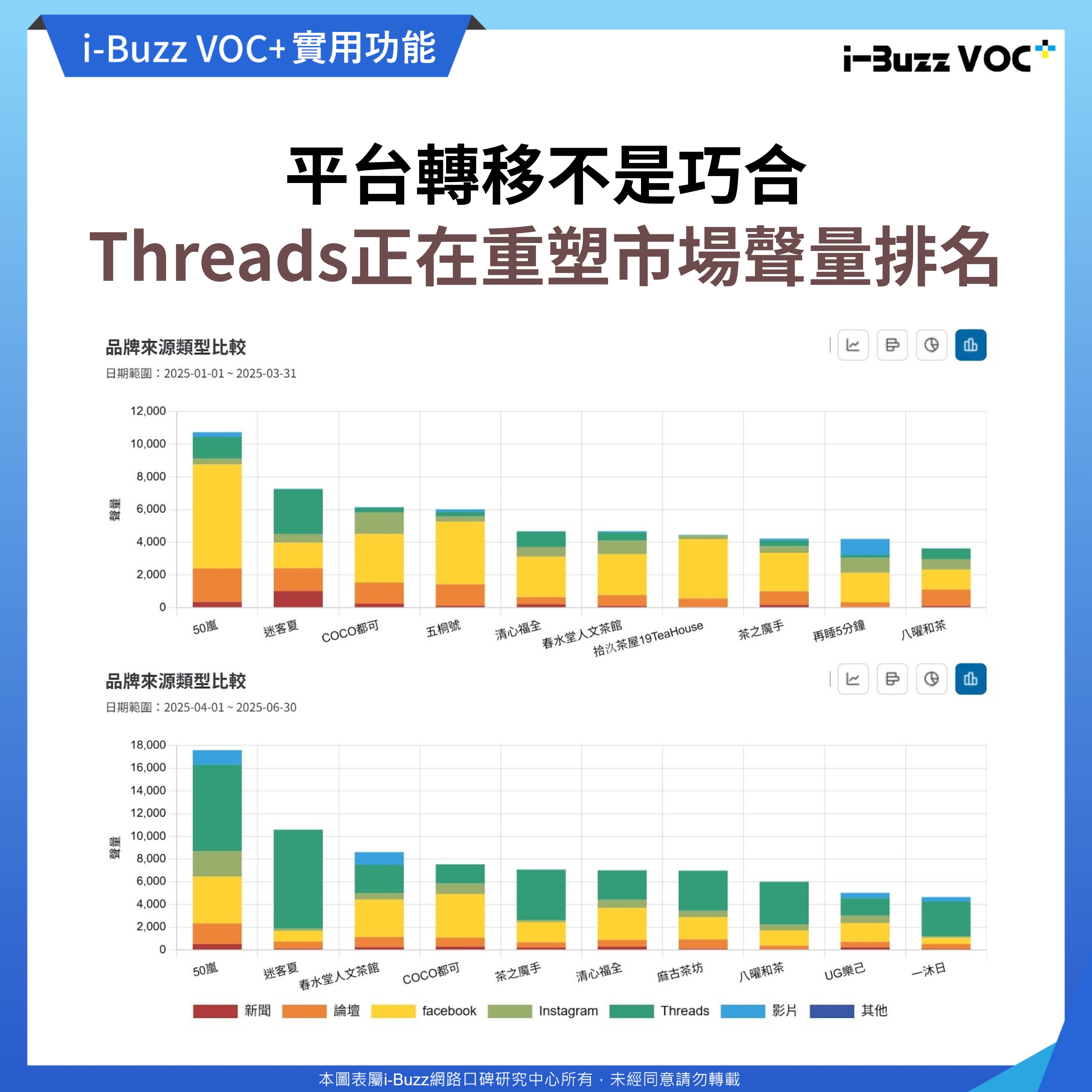 以手搖飲料市場為例,過往多數品牌聲量集中在Facebook、Instagram或論壇,排行榜長期呈現固定結構。然而自第二季開始,討論逐漸向Threads轉移,平台本身成為推動聲量排序的關鍵節點。從VOC+的來源類型比較可以看到,像五十嵐、迷克夏這些原本就處於聲量前段的品牌,在進駐Threads後不光保持領先,討論來源也從Facebook轉向Threads,整體曝光的成長動能也開始來自新平台。而春水堂人文茶館、茶之魔手等品牌,原本在榜單中段,過去即便推出新品可能也難以突破既有層級,但在Threads積極互動後,討論量不僅推升,排名也向前推進。更有代表性的例子則為八曜和茶,它在第一季仍處於榜單後段,聲量多來自Facebook或論壇;但第二季Threads討論快速增加,使其成功上榜中段層級,直接跨入主流競爭視野。