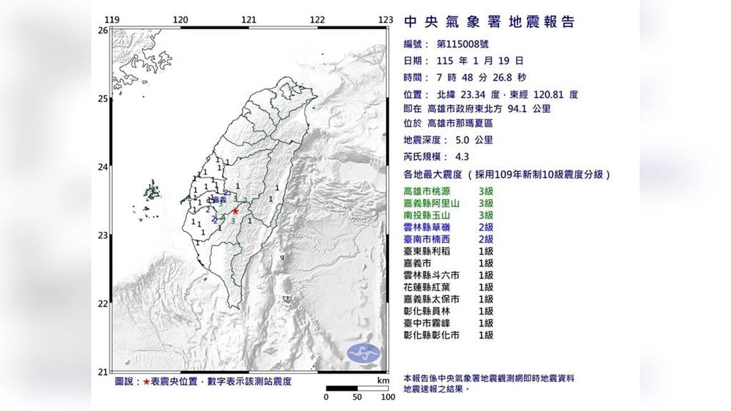 今(19)日上午7時48分,高雄市那瑪夏區發生規模4.3地震,深度僅5.0公里,最大震度高雄市桃源、嘉義縣阿里山、南投縣玉山3級。
