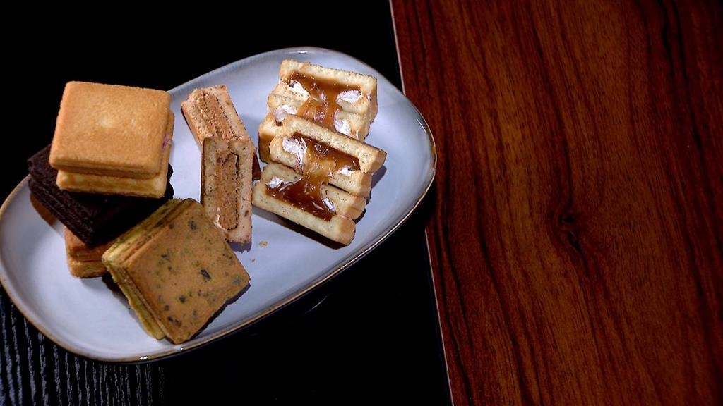 各種顏色的夾心餅,焦糖奶油一咬開,彷彿起司還會牽絲,香甜在口中融化,西式餅乾也能包入肉鬆花生,鹹甜交織,很有台灣味。超過100度高溫,讓砂糖漸漸焦化,老闆說,煮焦糖溫度很關鍵,太高、太低都會影響口感,還要加入奶油。業者游育偵:「對我們焦糖是要讓它焦化,所以溫度太高,或者是濕氣太重,這些都是我們滿在意的點,因為它可能會讓焦糖,不是我們要的狀態,可能會太硬或太軟。」