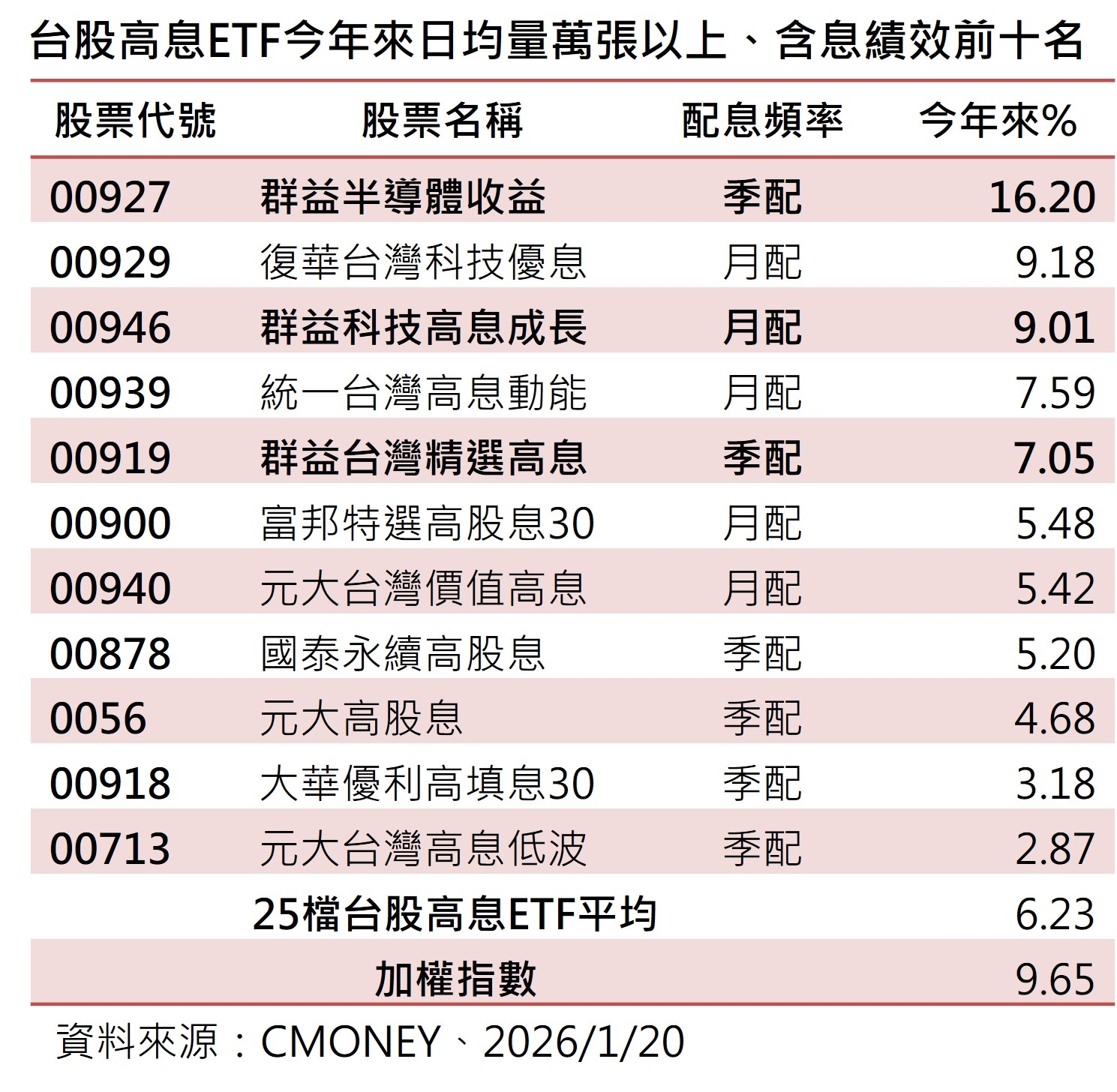 進一步觀察今年來日成交量逾萬張的台股高息ETF,包括群益台灣精選高息(00919)、群益科技高息成長(00946)、復華台灣科技優息(00929)、富邦特選高股息30(00900)、統一台灣高息動能(00939)今年來含息漲幅逾7%。