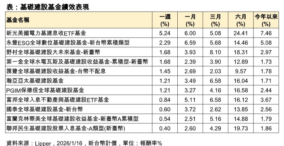 根據Lipper統計,截至1/16為止,基礎建設主題基金今年以來報酬率全數翻正,表現最好的新光美國電力基建息收ETF基金,上週漲幅5.24%,今年以來7.46%,在同類型基金表現一馬當先。