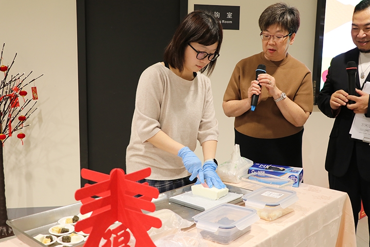 ▲本會附設聖若瑟失智老人養護中心營養師羅于姍現場製作,適合吞嚥障礙者與高齡長者食用的春節應景糕點「三色雪花糕」。(圖/天主教失智老人基金會提供)