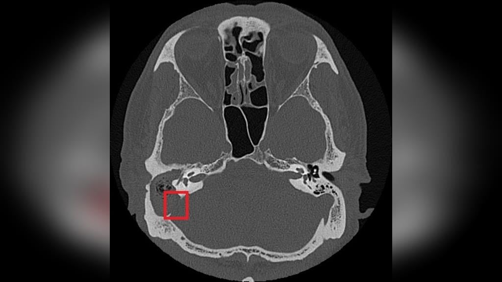 75歲的張先生右耳曾罹患慢性中耳炎並合併耳聾。近日右耳出現耳痛、耳脹並伴隨膿性分泌物,原先於診所治療未見改善,經檢查發現外耳道嚴重紅腫狹窄,內部堆積大量碎屑及膿液。慈濟醫院耳鼻喉科醫師鄭靜雯在進行局部清理及藥物治療後,症狀仍未明顯改善,後續更出現右側顏面神經麻痺。經顳骨電腦斷層檢查確認為慢性中耳炎併發膽脂瘤,且病灶已侵蝕顱底骨質,需安排住院治療。