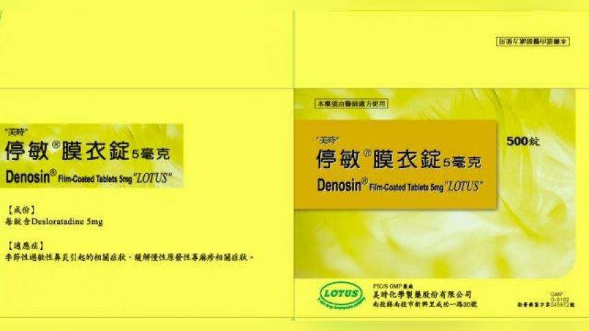 根據健保申報資料,該藥品2024年使用量達1233萬2008錠,是常見的抗過敏處方用藥。不過根據食藥署公布的最新藥品回收資訊,此次回收藥品「美時停敏膜衣錠5毫克 DENOSIN FILM-COATED TABLETS 5MG "LOTUS")」,許可證字號為衛署藥製字第045972號,批號為「E1216」。