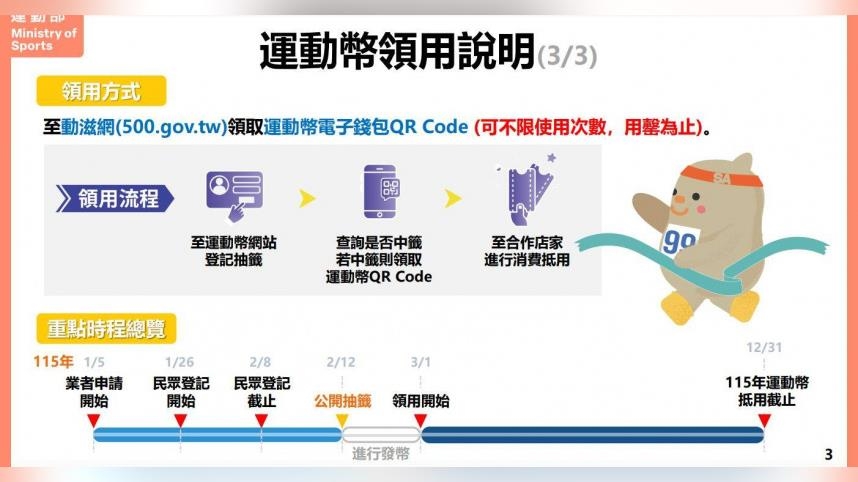 圖、文/CTWANT16歲以上國民都有機會!「青春動滋券」於民國115年(2026年)正式轉型為「運動幣」,預計發出60萬份、每份價值500元,盼能帶動全民運動風氣。民眾可在1月26日至2月8日期間,到「動滋網」登記抽籤,2月12日將直播公開抽籤,如幸運中獎,使用期限為3月1日上午10時起至年底。