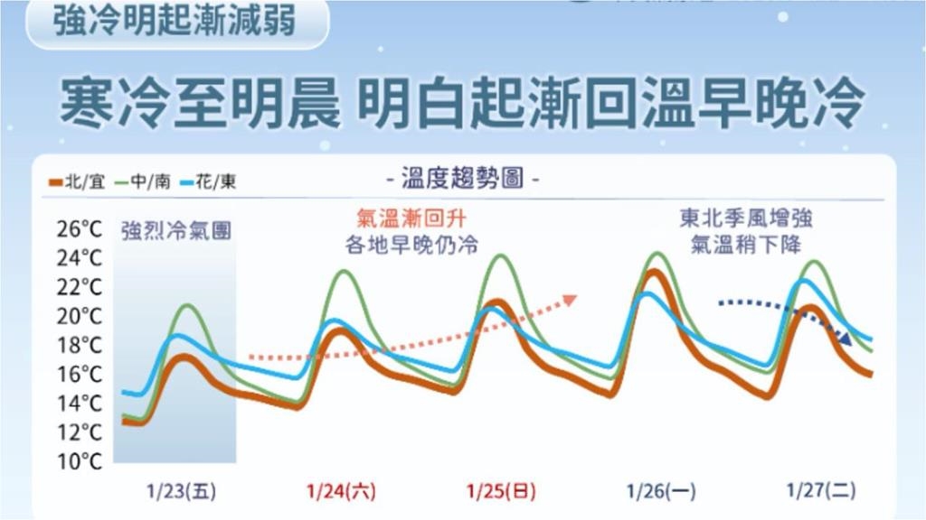 而白天起冷氣團逐漸減弱,氣溫回升,但受輻射冷卻影響,各地早晚仍冷,中南部日夜溫差明顯。隨著風向轉為偏東至東南風,水氣減少,降雨轉為零星局部,僅東半部有短暫陣雨機會。下一波冷空氣預估於1月27日(下週二)前後南下,強度為東北季風增強等級。