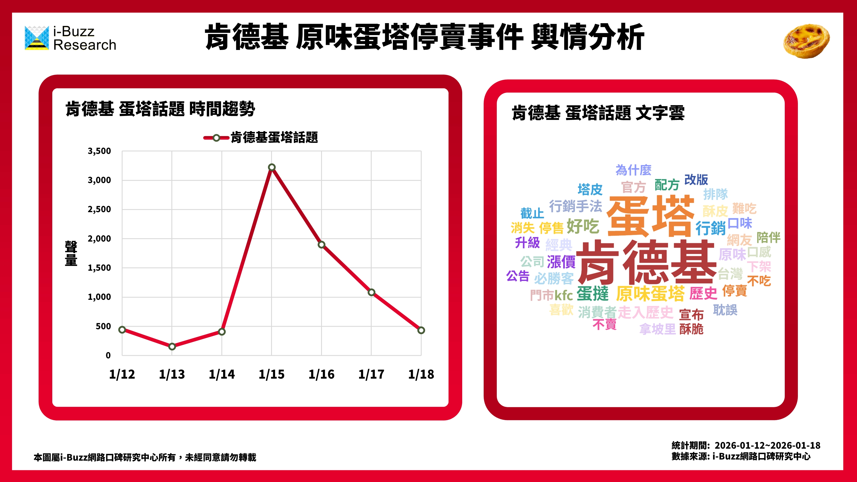 肯德基原味蛋塔停賣的消息在2026年1月15日一出,社群上立刻湧現大量討論,文字雲中「停賣」、「消失」、「為什麼」、「走入歷史」、「官方公告」、「錯愕」等關鍵字密集出現。雖然有不少人感覺到或許往後難在吃到肯德基蛋塔,而紛紛趕去肯德基嚐最後一次,然而就在前不久,同為富利餐飲旗下的必勝客才剛陷入打著結束營業實則只是更換招牌的誤導式行銷爭議,網友們紛紛猜想這次或許只是同樣的把戲,因此比起覺得「可惜」及「不捨」,更多人覺得這只不過又是一場「行銷作秀」。