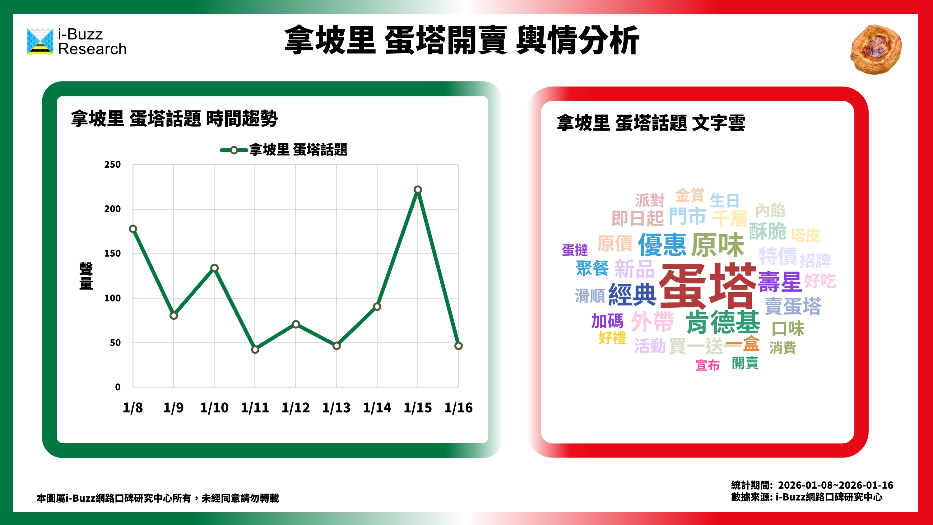 相較於肯德基的情緒風暴,拿坡里蛋塔開賣事件的輿情走向則完全不同。文字雲中「優惠」、「特價」、「買1送1」、「新品」、「活動」、「好吃」等關鍵字大量出現,顯示討論重點集中在價格、促銷與消費選擇。新品上市以價格優惠衝擊市場,本是後進者的必然操作;然而難能可貴的是,拿坡里不僅以實惠價格成功吸引消費者目光,在蛋塔產品的口味表現上也獲得不少網友讚賞,可謂在「價格戰」與「產品力」兩個面向都交出了合格答卷。