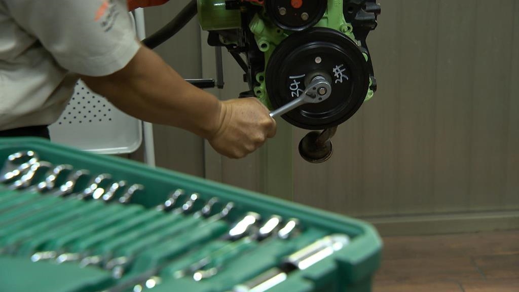 戴上護目鏡,示範台灣製造的手工具,根據統計,台灣手工具,去年對美出口高達50%,還好政府持續談判,爭取關稅15%不疊加,業者表示,是非常大的利多。