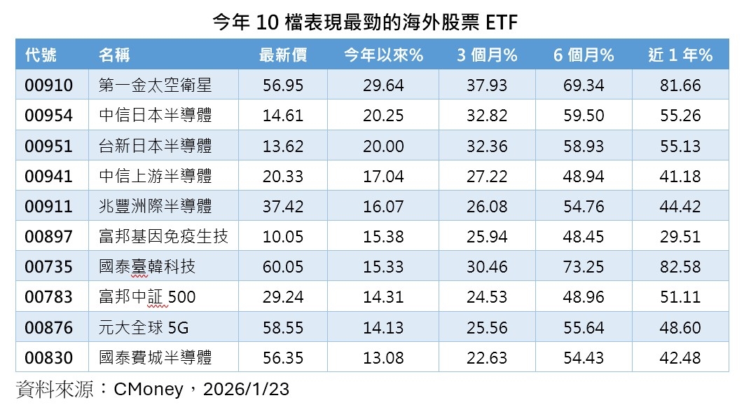 全球股市持續上攻,聚焦太空衛星、半導體與科技主題的海外股票ETF,績效也一馬當先,統計今年以來績效最佳的10檔,漲幅13%起跳,幾乎都是鎖定上述主題。其中,第一金太空衛星ETF(00910)漲幅逼近3成,表現最猛。