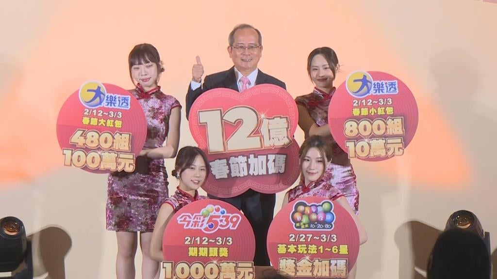 為迎接農曆春節,台灣彩券公司今(26)天宣布加碼,3款彩券總計加碼12億元、創史上新高;其中,大樂透從2月12日起「連續開獎20天」,除億元頭獎,今年還加碼480組100萬元「春節大紅包」,以及800組10萬元「春節小紅包」。