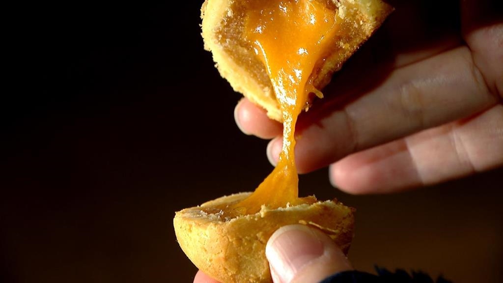鳳梨內餡,包入流心鹹蛋黃,再用外皮包起來,這是第二代老闆,接棒後花了半年,研發出來的。業者李典恆:「因為我很喜歡吃港式的奶黃包,想說這個流心餡能不能,包到我們台灣傳統的鳳梨酥裡面,把鹹蛋黃先磨成粉,然後我們跟麥芽糖,還有天然奶油去熬煮。」