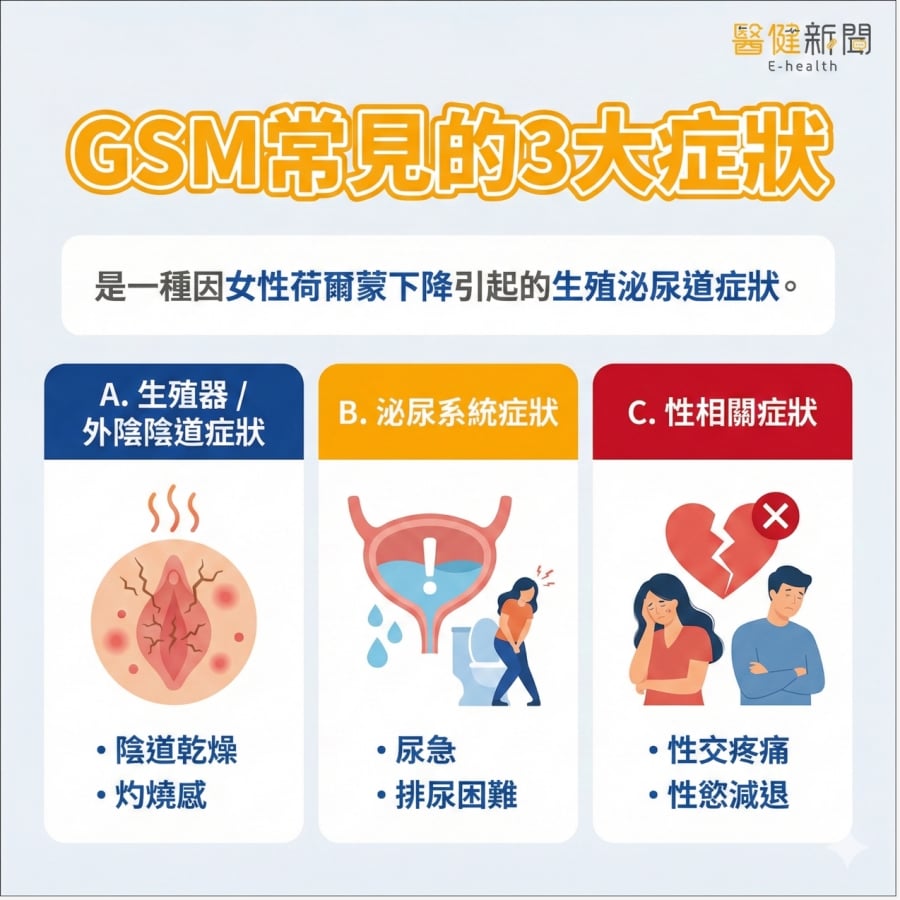 嚴絢上指出,根據全球研究顯示,GSM症狀盛行率極高,影響約84%的絕經後婦女。這些症狀通常從更年期後期開始出現並持續數年,包括: